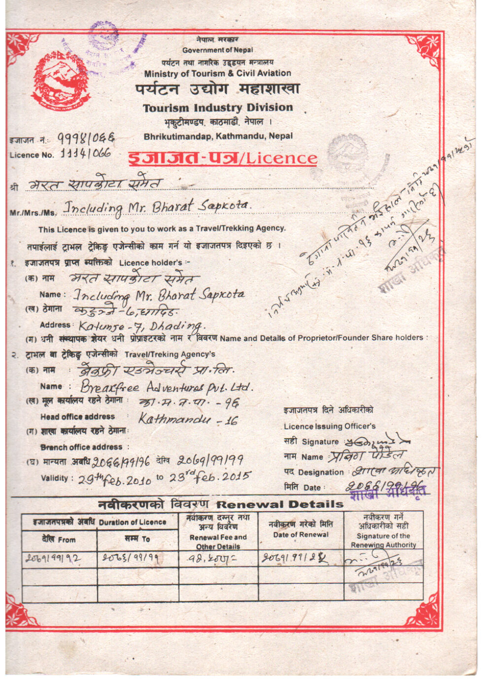LICENSE FROM MINISTRY OF TOURISM AND CIVIL AVIATION